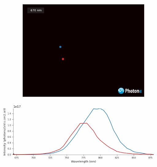 Images PL monochromatiques de cristaux de pérovskite excités par une puissance équivalente à 10 soleils avec les spectres des régions de cristaux de pérovskite désignées par les cibles bleues et rouges.